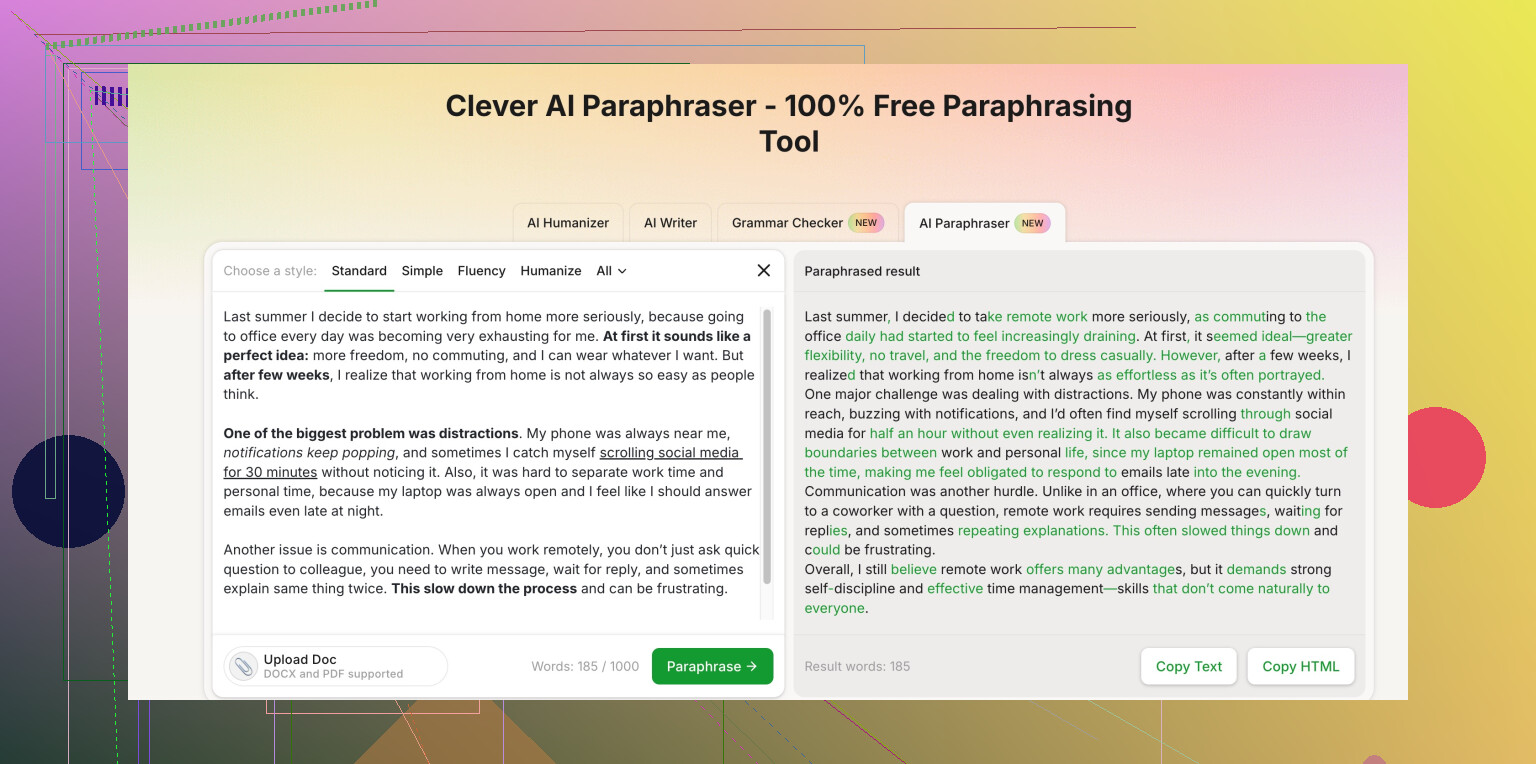 - Run that through a paraphraser like Clever AI Humanizer to smooth or vary phrasing.
