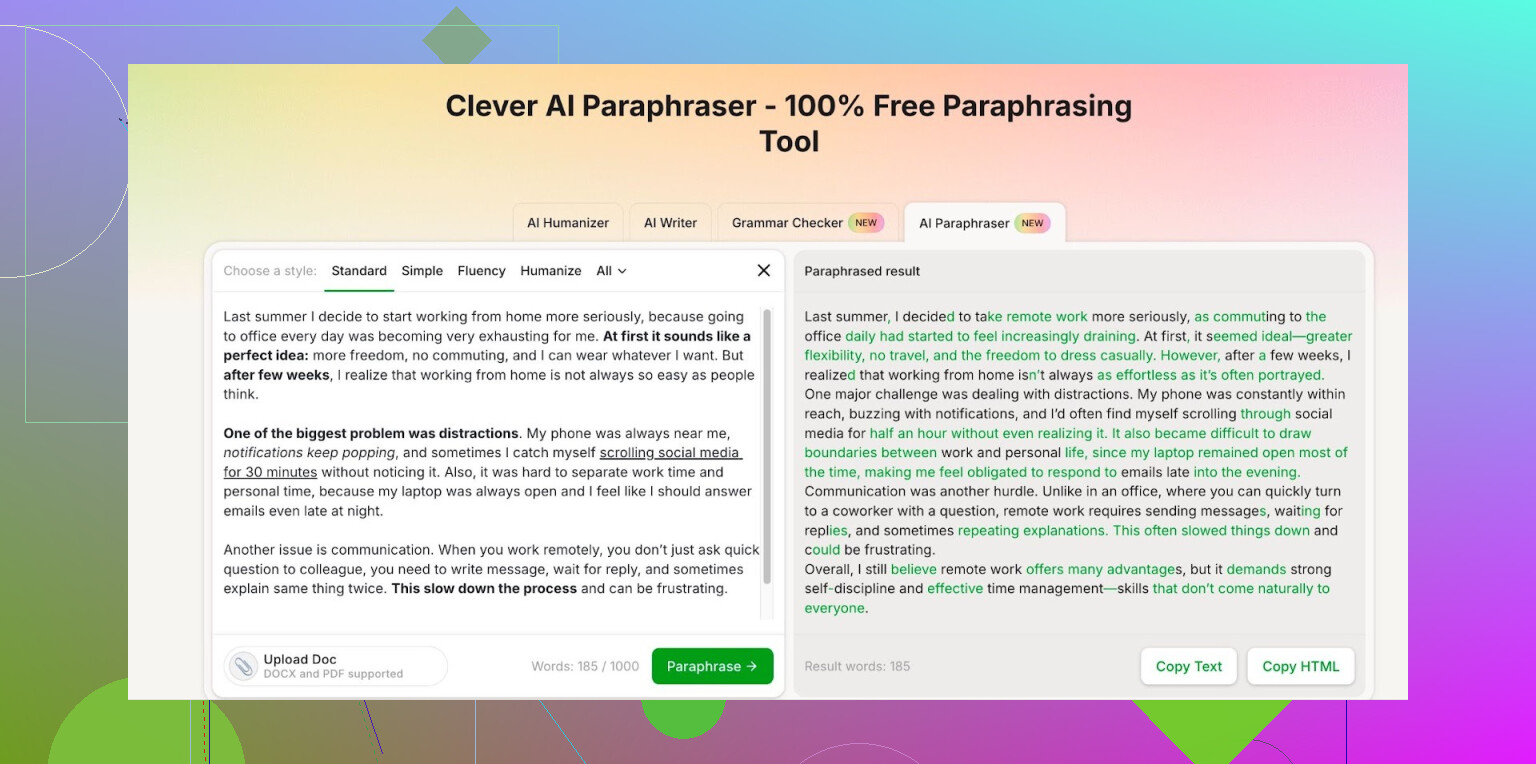 TL;DR: if you want one free tool that’s decent for everyday paraphrasing, Clever Ai Humanizer is a solid main option. The real “secret sauce” is you: write first, use it for light cleanup and tone, then manually dumb down or tweak anything that sounds like an AI trying to impress your English teacher.