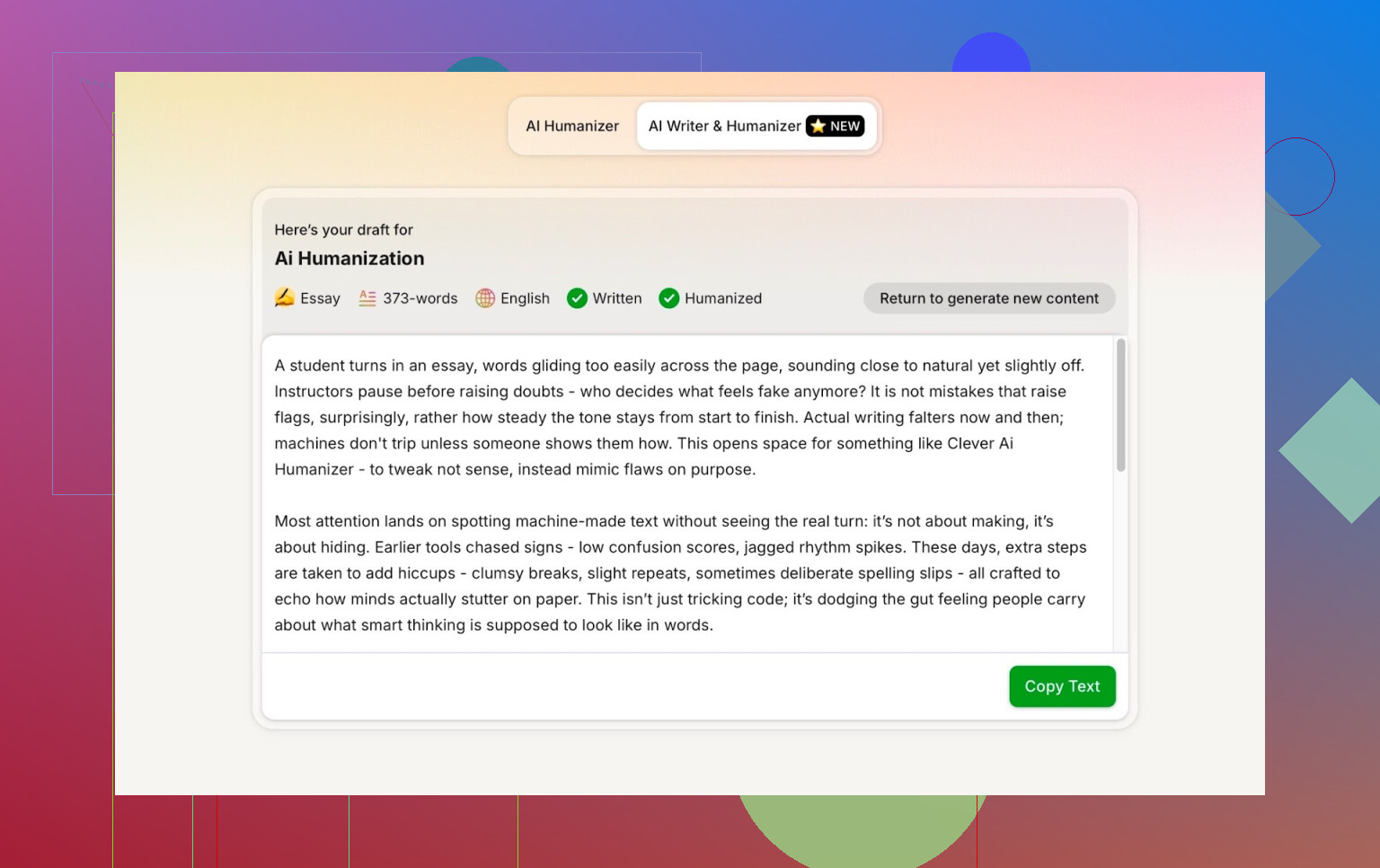 - Personliga brev, stipendieessäer, allt som ska låta unikt som du. Clever AI Humanizer tenderar att slipa bort just de kanter som får dig att låta som en verklig person med en historia.