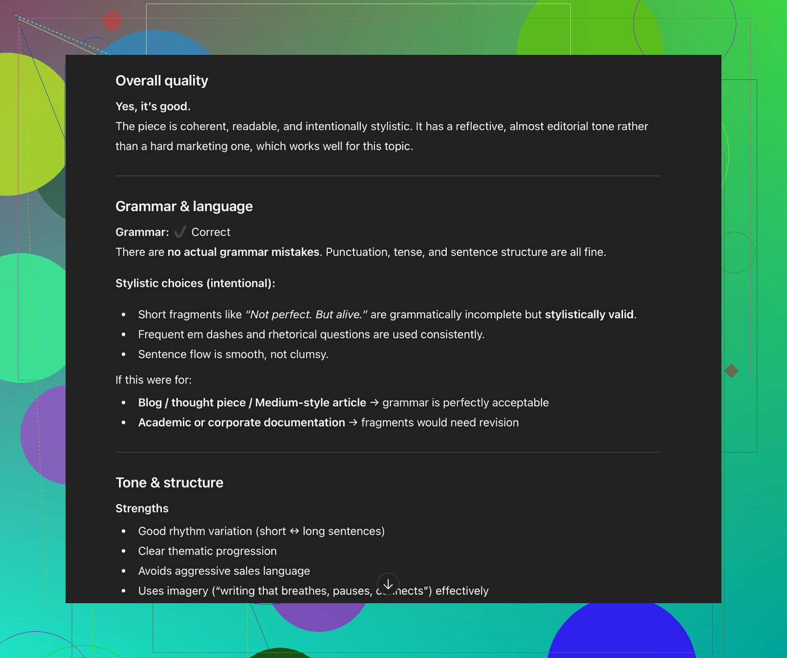 - Jag gillar faktiskt att det inte försöker fejka mänskliga misstag. De verktyg som slumpmässigt slänger in stavfel eller sönderhackade meningar känns mer misstänkta än hjälpsamma.