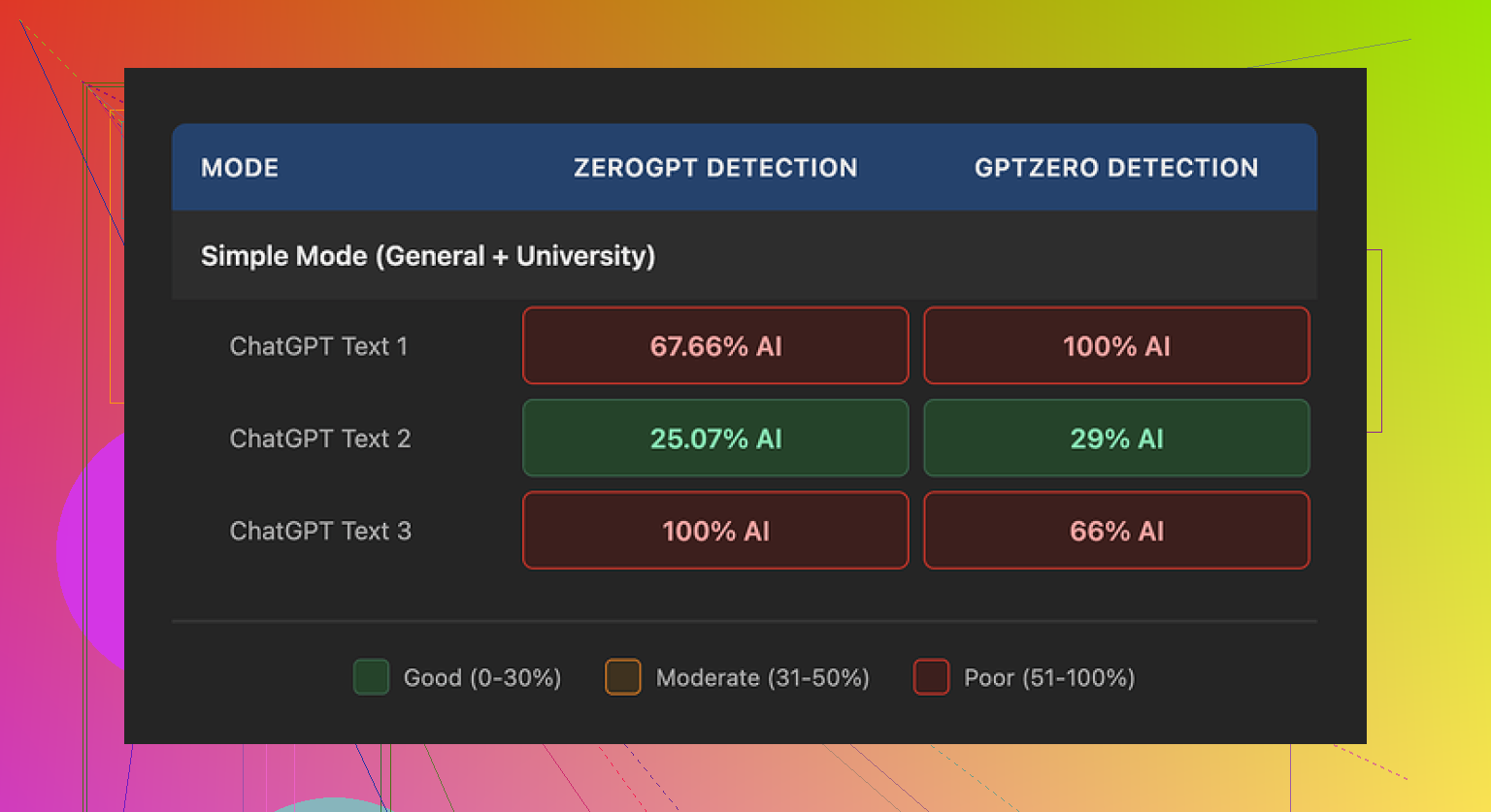 Ambas marcaron 100% en al menos un detector. Ese es el tipo de puntuación ante la que un profesor, editor o cliente no va a dudar antes de señalarlo.