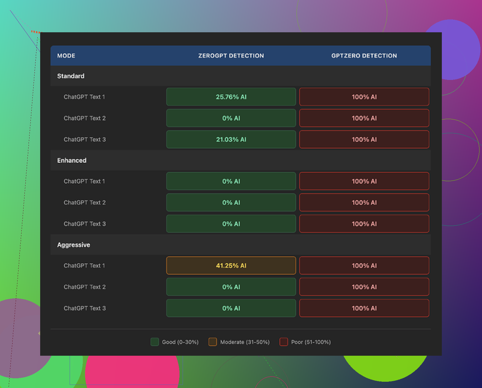 I ran outputs through GPTZero and got the same result over and over, 100% AI across Standard, Enhanced, and Aggressive. Bad score, sure. Still, the detector result was not even the main issue for me. The writing itself fell apart fast.
