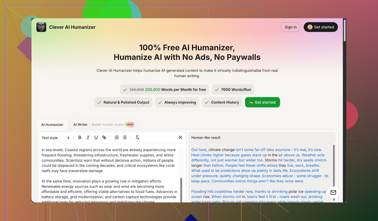 Clever AI Humanizer offers a completely free service with no hidden paywalls, no aggressive upselling, and generous monthly word limits. The tool provides 200,000 words per month at no cost, with up to 7,000 words per run, three distinct writing...